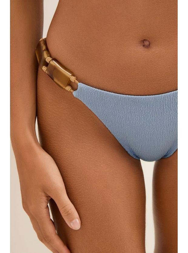 A calcinha de biquíni azul tem a cobertura Brasil. Pode ser usada mais alta ou mais baixa.