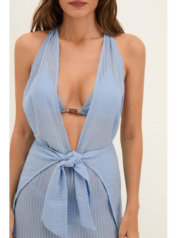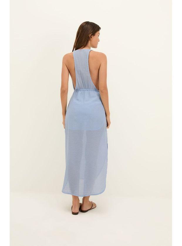 Uma opção leve com bossa, a saída longa azul Ida tem silhueta marcada e tecido em algodão listrado texturizado. O modelo apresenta decote e cavas profundas, transpasse vindo das costas e amarração frontal, que garantem ajuste perfeito. As barras arredondadas e as fendas laterais oferecem movimento e leveza à peça.